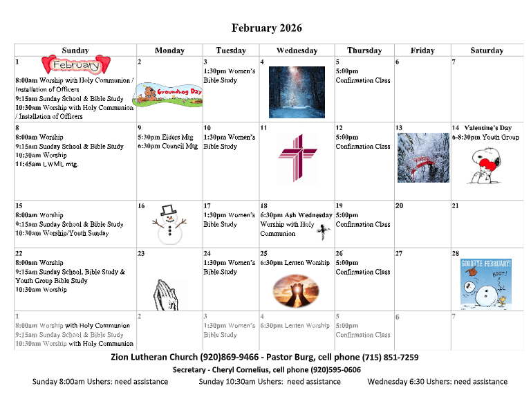 WE NEED FEBUARY USHERS: If you are willing to usher for Zion in Febuary at either the 8 or 10:30 service, please sign the Usher List in the hallway. Thank you!