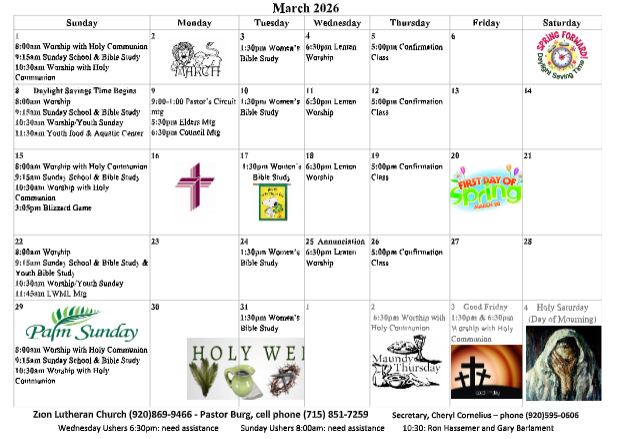 WE NEED FEBUARY USHERS: If you are willing to usher for Zion in February at either the 8 or 10:30 service, please sign the Usher List in the hallway. Thank you!